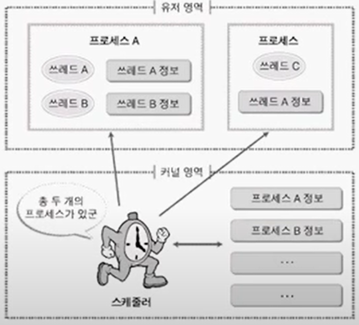 - 즉, 스케줄러가 "쓰레드 단위"로 스케줄링을 해줌.