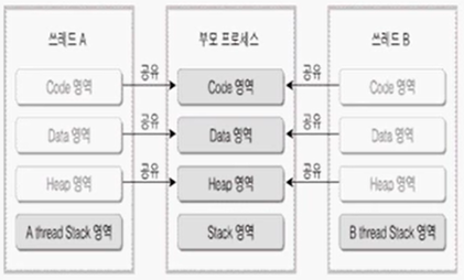뿐만아니라, Data영역/Heap영역도 공유하고 있음. 그래서 딱히 통신 기법들이 필요 없음.