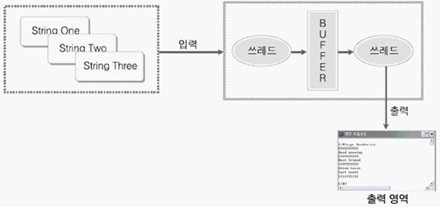 - 이때 입력 쓰레드를 생산자 쓰레드라 함. 출력 쓰레드를 소비자 쓰레드라 함.