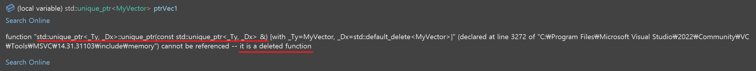 unique_ptr<MyVector> ptrVec2 = unique_ptr<MyVector>(new MyVector(7.f, 7.f)); // 위 아래 코드는 암시적이냐, 명시적이냐 차이.