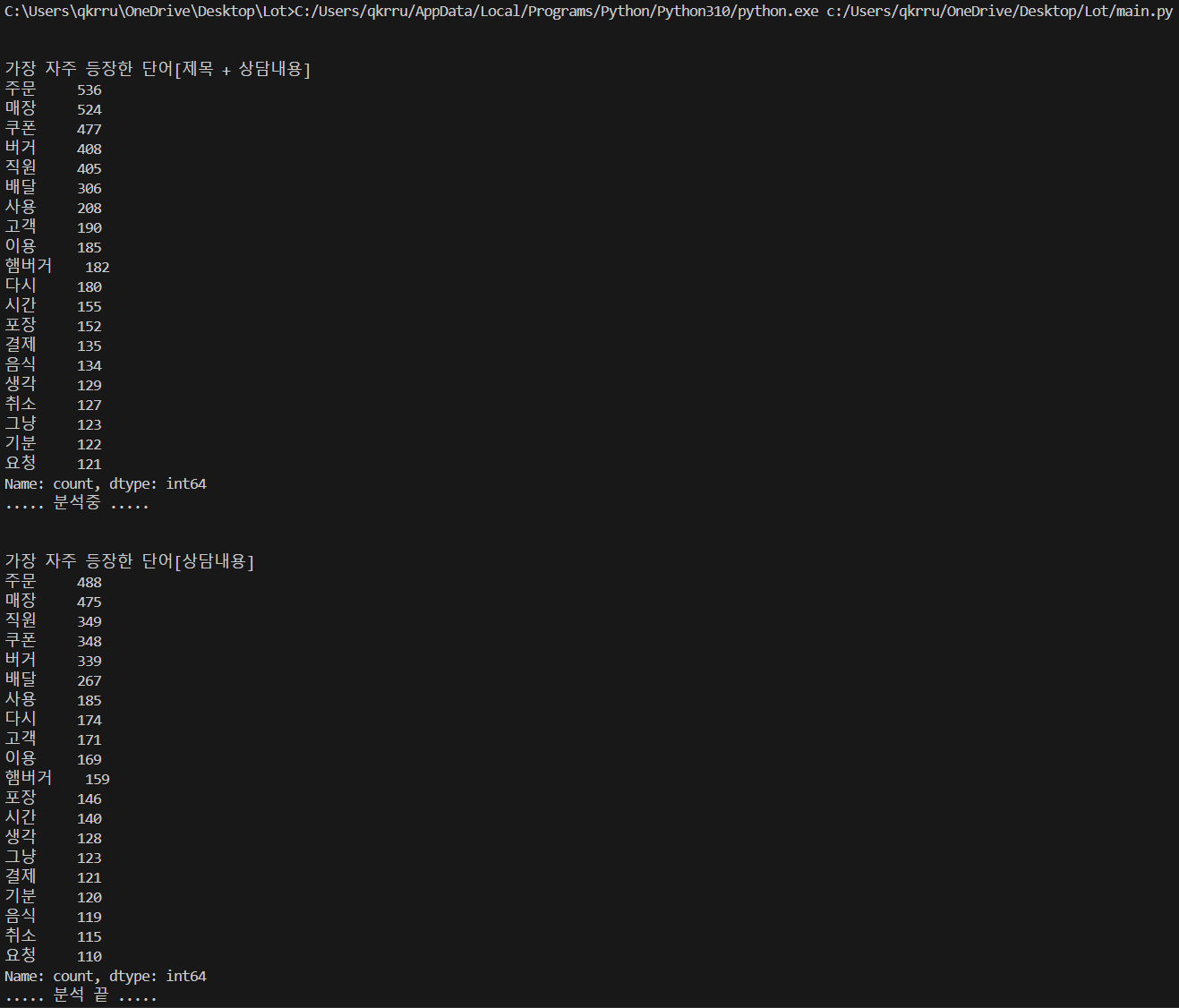 print("가장 자주 등장한 단어[제목 + 상담내용]")