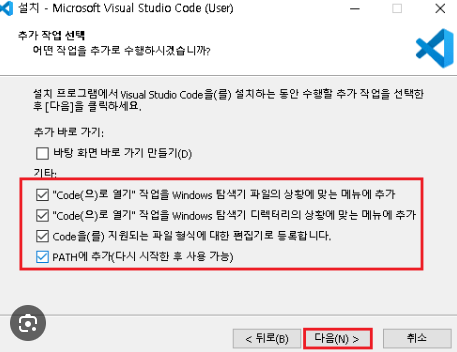 Visual Studio Code 설치 하실 때 아래 그림처럼 다 체크 필요합니다.