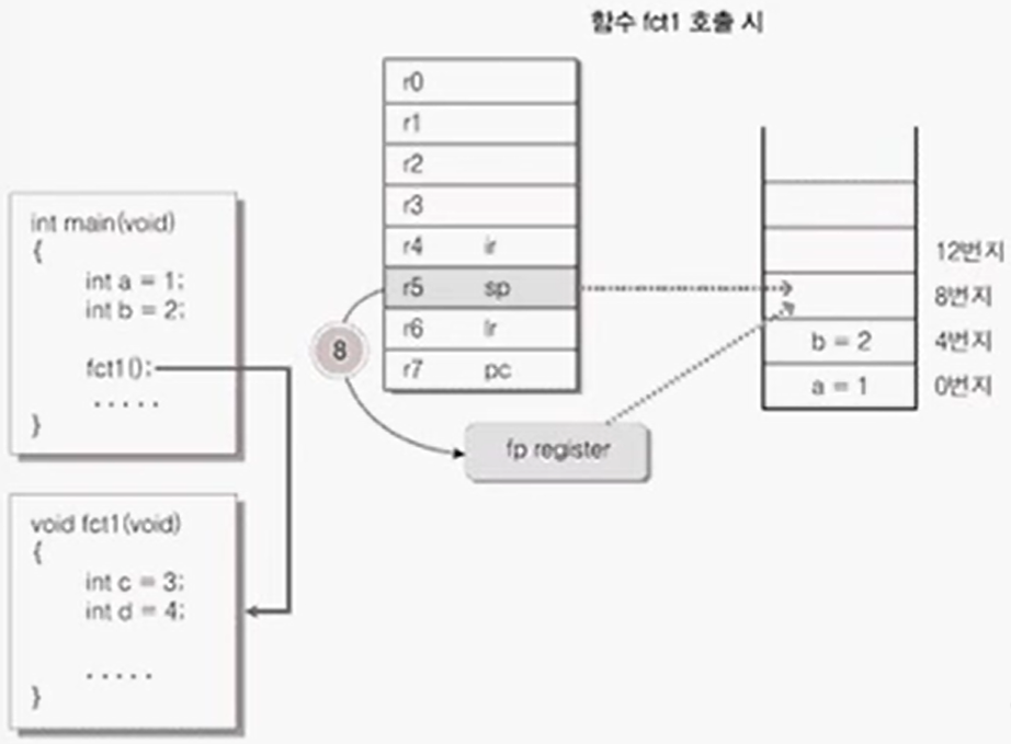 따라서 fc1() 호출 전에 현재 SP 레지스터 내용을 FP 레지스터에 백업함.