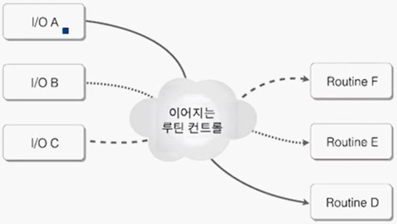 A IO, B IO, C IO가 끝났을때 각각 정해진 Routine(== 함수 호출)이 실행되게끔 구성.