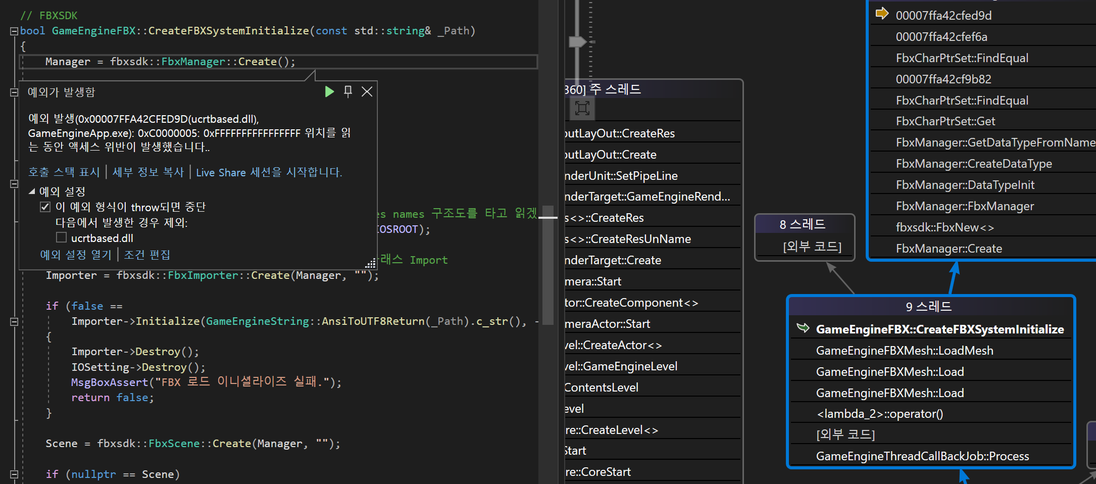 - 여러 차례 시도해보았으나, FBX SDK 관련 API에서 멀티 스레딩을 지원 안하는듯.