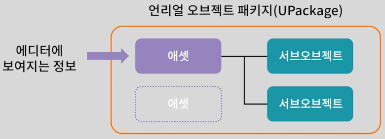 - 애셋은 다시 다수의 서브 오브젝트를 가질 수 있으며, 모두 언리얼 오브젝트 패키지에 포함됨.